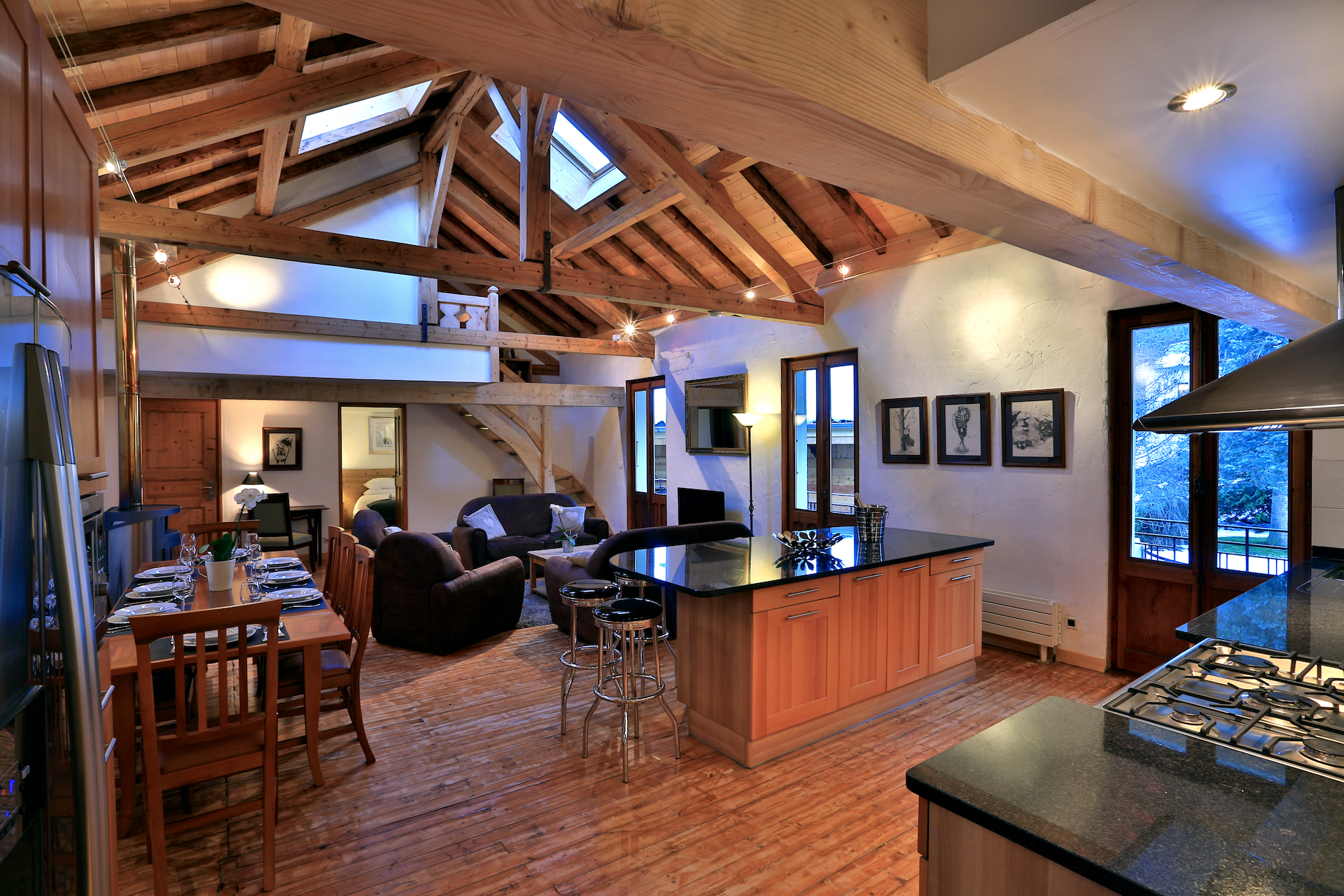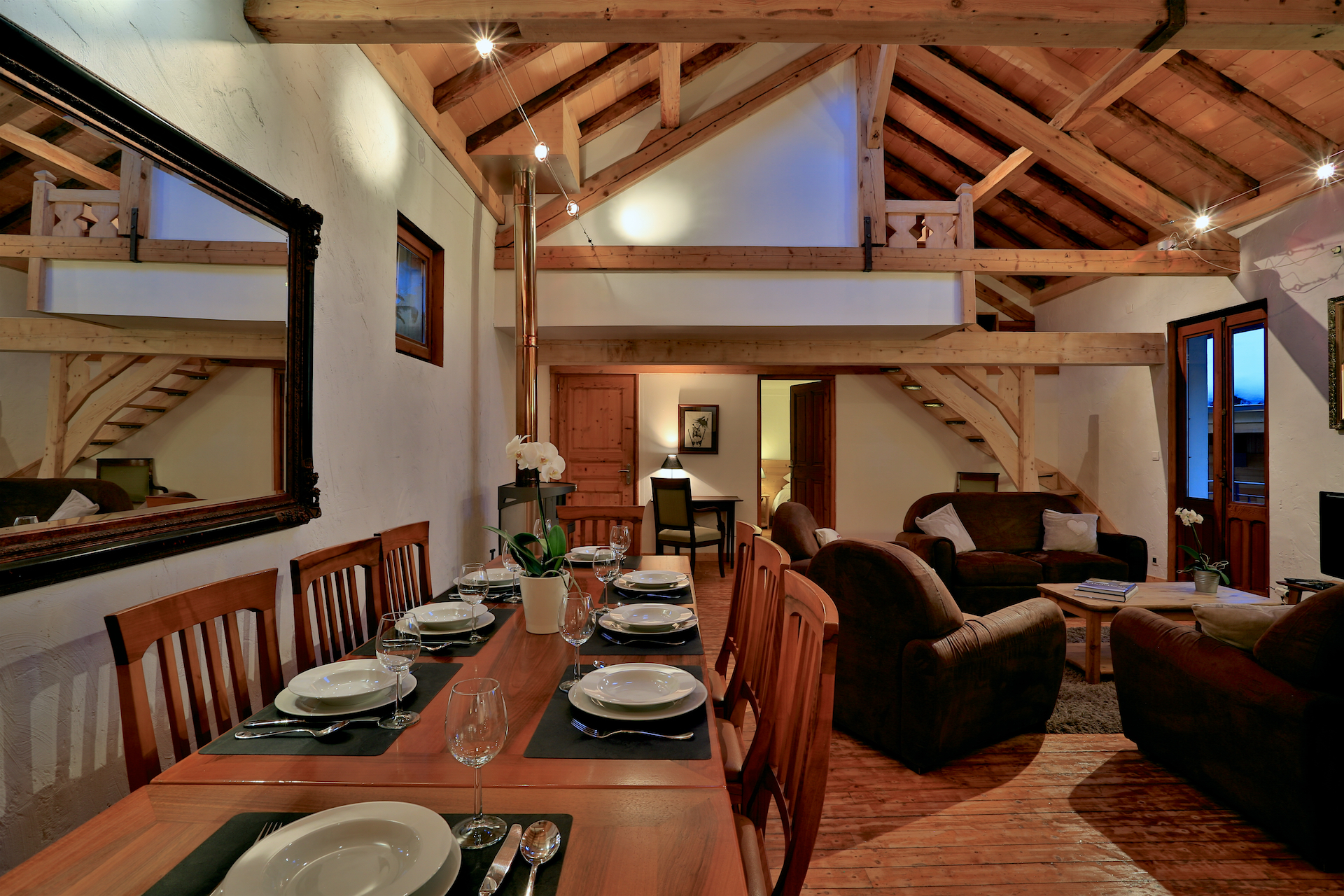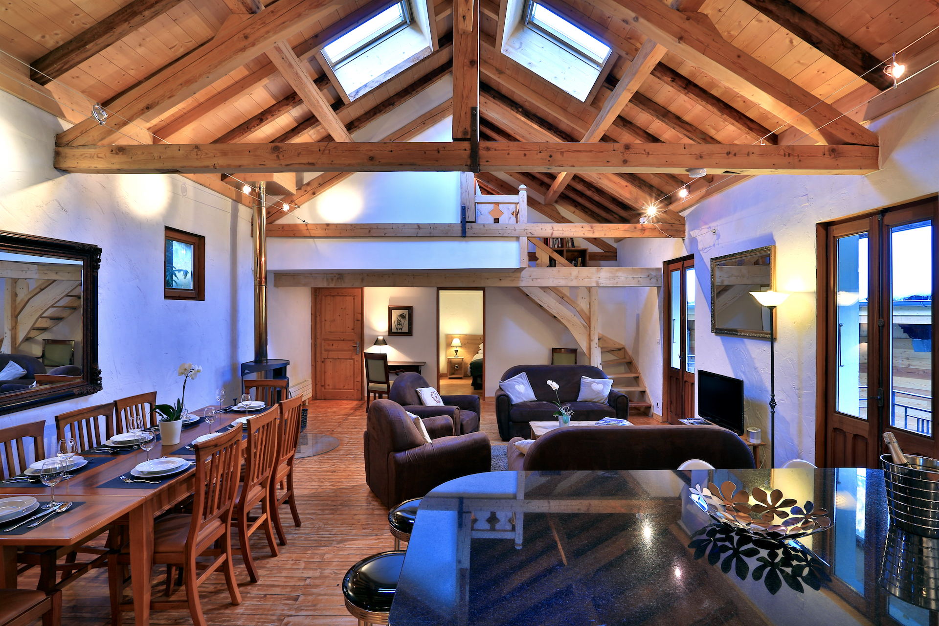 The stunning loft apartment occupies the whole top floor of the coach house. The apartment is a massive 160m2 with exposed beams and wood floors. There are a total of five full height doors opening up to reveal fabulous views of the Mont-Blanc. The loft is stylishly furnished and boasts all modern gadgets and up-to-date facilities that one would associate with a property of this quality. There is a flat screen TV, an iphone 6/ipad docking station, a DVD player, and free Wi-Fi internet connection. The kitchen is fully equipped with a 90cm range cooker and a large bar area. There is also a washing machine, dryer, dishwasher and microwave. There are 4 bedrooms, 2 doubles, 2 twins and 4 bathrooms (all ensuite). Infant travel cots and highchairs are available upon request. The apartment sleeps a maximum of 8 guests.