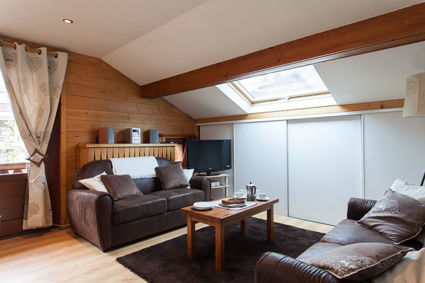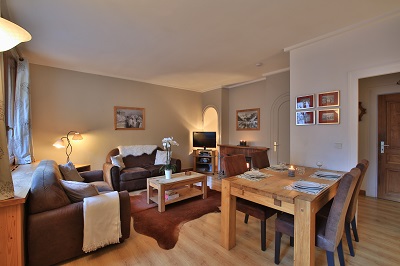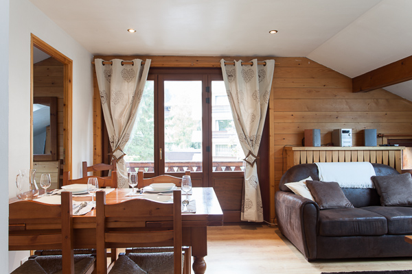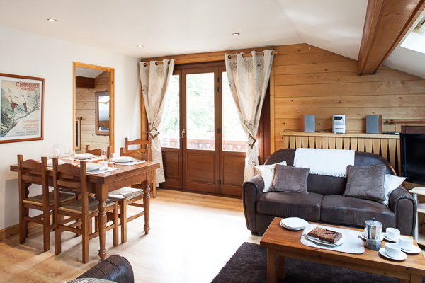 Sapin 2 is located on the first floor of a traditional chalet and provides a very spacious 75m2 of living accommodation. The lounge doors open on to a private terrace with fantastic views of the Mont-Blanc. The apartment has two bedrooms, one double and one twin. One bedroom has an ensuite shower room and there is a second separate bathroom. The kitchen has all modern appliances including washing machine, dishwasher and microwave. In the lounge there a cosy log fireplace (behind glass), flat screen TV, a stereo, a DVD player and free Wi-Fi internet access. Infant travel cots and highchairs are also available upon request. We would recommend up to a maximum of 4 guests.